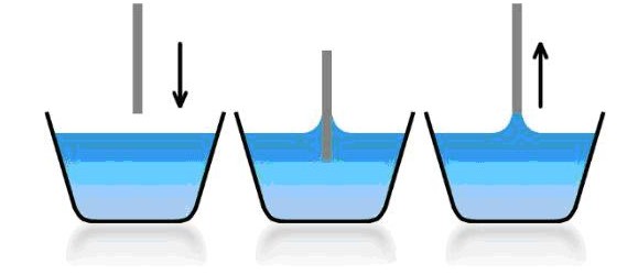 高精度的Du Noüy方法最早是由Padday等人所提出的(J Chem Soc Far Trans 71: 1919-1931, 1974)。這種技術(shù)非常簡單:將一根細(xì)桿(不是一個(gè)環(huán)或者一個(gè)板)浸沒到樣品中,然后拔出,對(duì)最大的力進(jìn)行測定。探針的直徑是不相干的,只有直徑變化才需要重新校準(zhǔn)。Kibron公司的所有儀器都是全自動(dòng)的并且檢測快速。當(dāng)利用一個(gè)已知表面張力的液體做完校正后就沒必要去修正。彎液面的重量僅僅依賴于表面張力、桿的直徑以及液體的密度(參見上述Padday et al的文章)。