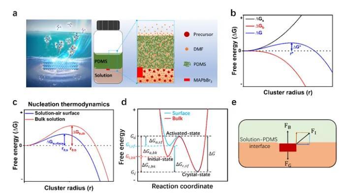 圖2.MAPbBr3鈣鈦礦結晶與晶體生長。(a)PDMS輔助結晶原理圖;(b)形核半徑與自由能的關系;(c)溶液的表面和內部的形核半徑的比較;(d)生長過程中自由能變化圖解;(e)界面懸浮生長的力學圖解。