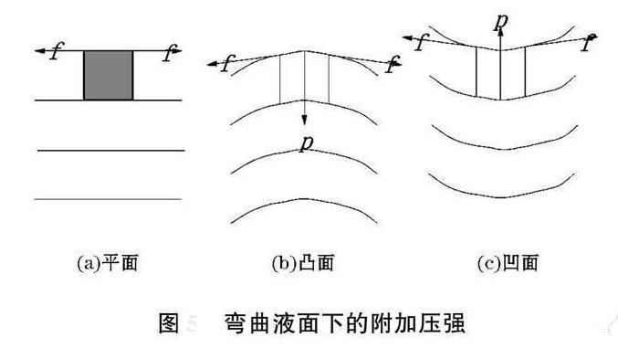 如果熔體表面是凸面,如圖3b所示,因表面張力沿周界與熔體面相切,則沿周界各個(gè)方向的表面張力f將產(chǎn)生一個(gè)指向熔體內(nèi)部的合力p(正壓力),使得熔體表面曲率變小。如果液面是凹面,如圖3c所示,表面張力的合力將指向熔體外部,對(duì)熔體則產(chǎn)生一個(gè)負(fù)壓力,使得凹面變平,甚至有可能轉(zhuǎn)化為凸面。由于表面張力的作用,熔體表面能夠截凸補(bǔ)凹,自動(dòng)修復(fù),表面平滑,這正是陶瓷釉層表面能夠平整光滑的主要原因。