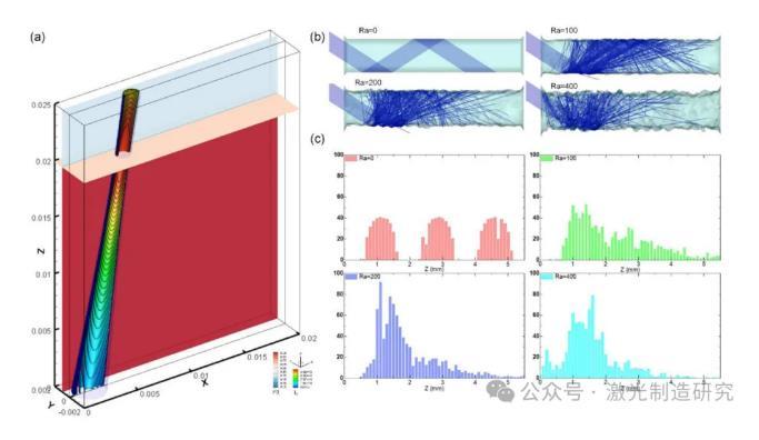 圖1(A)中顯示了計算領域的圖形說明。計算域的大小設置為20 mm×2 mm×25 mm。計算域劃分為1.25億個邊長為0.02 mm的六面體網格。在初始狀態下,將厚度為20 mm的下部設置為工件層(階段2),將厚度為5 mm的上部設置為環境空氣層(階段1)。前壁(Y=0)被設置為對稱邊界條件,頂面(Z=25 mm)被設置為壓力輸出邊界條件,其他表面被定義為壁邊界條件。使用了Ansys-FLUENT®軟件用于模擬。采用C語言編寫的用戶自定義函數(UDF)實現光線跟蹤過程。圖1(B)顯示了光線追蹤過程的驗證案例,在該案例中,一束平行光束被射入具有不同表面粗糙度的方腔。圖1(C)表明,在高Ra條件下,隨著表面粗糙度的變化,能量分布明顯改變,更多的能量集中在第一反射區。表3列出了模擬中使用的物理特性。