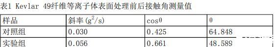 測量結果如下表所示,測量結果為三次平行樣的平均值。可見經等離子體表面處理后,芳綸纖維與水的表面接觸角降低16°,潤濕性提高。