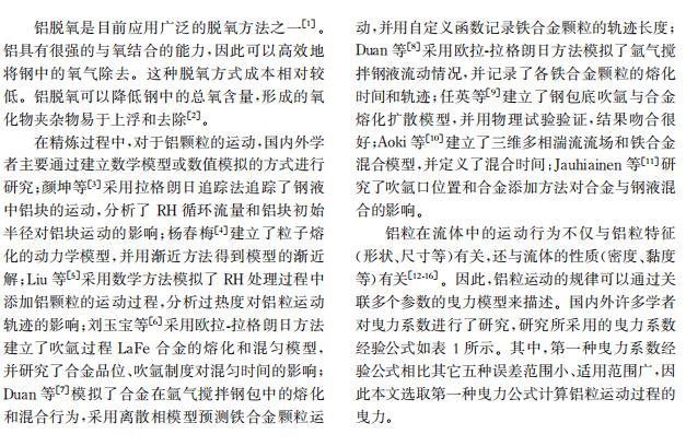 摘要: 二次精煉過(guò)程中,鋁是鋼液進(jìn)行脫氧及合金化的主要物料之一,但純鋁的密度小于鋼液,能否穿越渣層與鋼液接觸及接觸時(shí)間對(duì)鋁的脫氧效果和鋼中溶解鋁的含量有直接影響。在忽略鋁的熔化、溶解及化學(xué)反應(yīng)的情況下,通過(guò)對(duì)鋁粒運(yùn)動(dòng)過(guò)程受力分析,建立鋁粒在氣-渣-鋼相內(nèi)的三維運(yùn)動(dòng)數(shù)學(xué)模型,明晰鋁粒尺寸及入爐高度對(duì)鋁粒運(yùn)動(dòng)軌跡的影響。