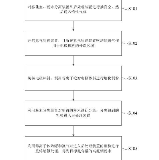 本實施例中,利用氮氣對電極棒料101的外沿區域進行作用,使氮氣與電極棒料101外沿的熔池進行反應,熔池吸氮過程降低了熔池外沿待破碎液膜區域的表面張力,使粉末粒度更?。煌瑫r電極棒料101中心區域的液膜移動到電極棒料101外沿時,由于氮氣作用于外沿區域,會繼續對該液膜進行擾動,降低了液膜的表面張力,進而得到粒徑更小的粉末;由于制得的粉末粒徑更小,粉末冷卻速度較快,氮元素析出更少,存留在細粉中的氮含量更高,從而得到氮含量更高的高氮鋼粉末,最終達到制備細粒徑高氮含量的高氮鋼粉末。