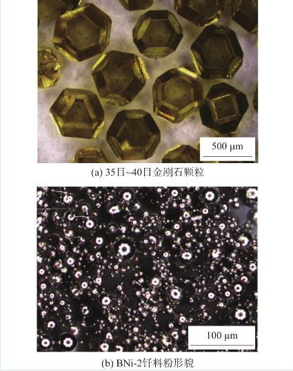 金剛石磨粒的抗壓和耐磨性能與其自身品級有關,精選河南黃河旋風股份有限公司晶形完整、強韌度好、無缺陷的高品級HSD90型人造金剛石,圖1為金剛石和BNi-2釬料粉的形貌,其中金剛石的原始形貌如圖1a所示,所用粒度為35目——40目。釬涂試驗前,利用角磨機或噴砂機清理基材表面,然后利用丙酮進行超聲波清洗30 min,以避免試驗過程雜質干擾,保證金剛石磨粒的透光性。釬涂試驗基材為65Mn鋼,激光釬涂試樣尺寸為200 mm×100 mm×10 mm.釬料合金既要潤濕金剛石和鋼基材,形成冶金結合,又要兼顧耐磨性,與涂層硬質顆粒耐磨性能匹配。選用釬料合金為200目NiCrSiB(Ni82Cr7Si4.5B3.1Fe3,后文簡稱BNi-2)釬料,形貌如圖1b所示。BNi-2釬料具有耐磨性好、成本低等優點,合金中Cr元素可大幅提高釬料/金剛石界面結合強度,B元素和Si元素的添加降低了釬料熔點,有助于減少金剛石熱損傷。