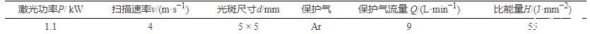 激光釬涂是利用激光作為熱源使釬料層熔化,進而潤濕并連接金剛石與基材的工藝,其原理如圖2所示。與傳統真空釬涂工藝相比,激光釬涂工藝可顯著降低涂層能量輸入,大大縮短熱循環周期,具有非常好的結構和工藝適應性。文中激光釬涂試驗系統包括功率為6 kW的LYS-6000-ST2型光纖激光設備和AcutEye型庫卡軌道機器人。分別對釬料涂層和釬料/金剛石涂層進行激光釬涂試驗。金剛石釬涂試驗時,首先將BNi-2釬料鋪在65Mn基板上,粉末厚度為0.5 mm,然后在BNi-2釬料層上沉積金剛石顆粒,隨后在金剛石表面再預置一層0.5mm的粉末釬料。首先,預置1 mm厚度的釬料合金粉末層,然后進行釬涂試驗,工藝參數如表1所示。試驗過程中,利用激光釬涂系統配備的高速攝像機觀察釬料層的熔化過程。使用Zeiss Smartzoom5型超景深顯微鏡對涂層形貌進行三維觀察和尺寸測量。通過Image-pro plus 6.0軟件對涂層超景深圖片色域進行調整,直至色域所覆蓋的區域為孔隙所占區域,測量方式選擇Per area(單位面積)。
