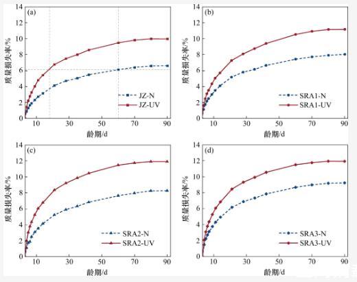 暴露在強紫外線輻射環境中的各組試樣的質量損失率均明顯大于標準干燥環境中試樣的質量損失率。在3~21 d齡期內,各組試樣在強紫外線輻射環境中的質量損失增長速率明顯大于其在標準干燥環境中的質量損失增長速率。以基準組(JZ)為例,強紫外線輻射環境下水泥石在18 d齡期時的質量損失率達到標準干燥環境下水泥石在60 d齡期時的質量損失率(穩定值),并最終在90 d齡期時,JZ-UV組的質量損失率達到了JZ-N組的1.5倍。這是強紫外線輻射的“光化學作用”引起的。當水分子吸收光子后,內部的電子會發生能級躍遷,形成不穩定的激發態,并發生離解反應,使H—O鍵斷裂生成H+和HO-,從而加速水分子的運動,促進了水泥石表面的干燥,增大了水泥石體系內部與外部環境的濕度梯度,導致水泥石中的水分快速散失。