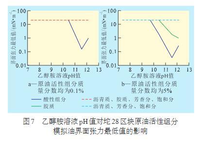 從乙醇胺溶液的pH值對不同質量分數坨28區塊原油活性組分模擬油界面張力最低值的影響(圖7)可看出,當活性組分質量分數為0.1%時,只有酸性組分與有機堿發生作用;當質量分數增大至5%時,膠質組分開始作用,而瀝青質界面張力依舊較高。這可能是由于坨28區塊原油瀝青質中酸性組分含量過少造成的。因此,對于坨28區塊原油,與乙醇胺作用的難易順序為:酸性組分最強,膠質次之,瀝青質、飽和分和芳香分與之作用比較微弱。