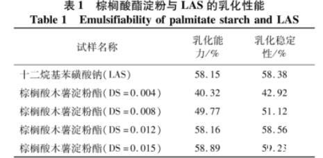 棕櫚酸酯淀粉與常用表面活性劑LAS的乳化性能比較見表1。