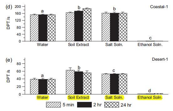 圖 4 水滴滲透時間 (DPT),2:1 w : w 2 小時 用于 Desert-1 和 沿海 1 土壤。 誤差棒顯示重復(fù)的標準偏差 滴。 小寫字母給出了兩側(cè) t 檢驗的結(jié)果。 不同字母表示均值在 P ? 0.01 顯著性水平。