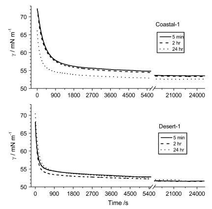 1:1 提取物的動態(tài)表面張力測量 表明達到平衡的時間 γLV 從大約 15 分鐘到長達 5 小時不等(圖 1)。 在所有情況下,都有一個相對較快的初始速度 γLV 的變化,這可能是擴散受限的,和 然后是一段長時間的低利率 γLV 的變化。 平衡達到率低的時期被假定為至少兩個過程的結(jié)果:(i)不同分子之間的表面競爭 吸附位點; (ii) 表面分子的重排。 時間之間沒有明顯的關(guān)系 實現(xiàn)不同的平衡 γLV 和提取時間 土壤(圖 1)。