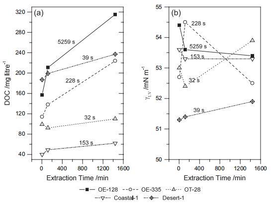 圖2 土壤溶解有機碳(DOC)含量(a)和表面張力(γLV)(b) 提取作為提取時間的函數(shù)。 水 以秒為單位的液滴穿透時間 (WDPT) 是 標在面板上。