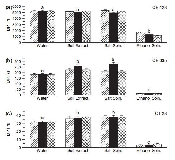 圖 3 液滴穿透時間 (DPT) 水、1:1 土壤提取物、鹽溶液和不同土壤的乙醇溶液:(a) OE-128; (b) OE-335; (c) OT-28; (d) Coastal-1; (e) 沙漠-1。 誤差線顯示標準偏差 復(fù)制滴。 小寫字母給出 兩側(cè) t 檢驗的結(jié)果。 在給定的 窗格中,不同的字母表示均值 在 P ? 0.01 顯著差異 癌癥水平。 對于 t 檢驗,結(jié)果為 三個提取時間(5 分鐘、2 小時和 24 小時)一起考慮,因為它們的 γLV 值非常相似(圖 2b)。