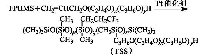 按n(Si-H)∶n(C=C)=1∶1比例將FPHMS和F6以及溶劑異丙醇加入裝有攪拌器、回流冷凝管和溫度計的四口燒瓶中,通N2,攪拌15 min,然后升溫至70——90℃,再滴加氯鉑酸醇溶液(以鉑計,占總單體質量分數的4.0×10-5),并保溫反應4——6 h后,于90℃、60 kPa真空脫低沸物30 min,冷卻,得淺褐色至褐色透明液體,即氟硅表面活性劑(FSS),其黏度為850 mPa·s,并溶于冷、熱水。反應式為: