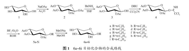 采用全乙酰化的木糖(2)在四氯化錫催化下與一系列脂肪醇發(fā)生偶聯(lián)反應(yīng),對時(shí)間要嚴(yán)格控制,否則有部分轉(zhuǎn)化成α-異構(gòu)體,當(dāng)時(shí)間過長時(shí),還會形成以α-糖苷為主的產(chǎn)物和少量2-位脫保護(hù)的糖苷副產(chǎn)物。參考烷基-β-D-葡萄糖苷等合成與性能研究成果,按照Scheme1所示的路線,以D-木糖(1)為原料通過乙酰化、脫1-位乙酰基、與三氯乙腈反應(yīng),得到相應(yīng)的三氯乙酰亞胺酯(4)。采用易于構(gòu)筑1,2-反式糖苷鍵的三氯乙酰亞胺酯法,以三氟化硼乙醚作糖苷化偶聯(lián)反應(yīng)的催化劑,使得具有鄰基參與效應(yīng)的三氯乙酰亞胺酯(4)與相應(yīng)的脂肪醇反應(yīng)及相應(yīng)的脫乙酰基保護(hù),合成一系列烷基-β-D-吡喃木糖苷,如圖1所示。本文作者對其溶解性、表面張力、乳化性能、液晶性能、熱穩(wěn)定性等理化性質(zhì)進(jìn)行研究。