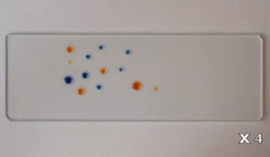 這個難度比較高,不過現(xiàn)象非常有意思。在這里使用的是含有丙二醇和水的液體食品色素,這些液滴經(jīng)過不同程度的稀釋。在非常潔凈的玻璃片上,它們因為蒸發(fā)而產(chǎn)生表面張力的變化,從而出現(xiàn)彼此“追逐”的現(xiàn)象。詳情: