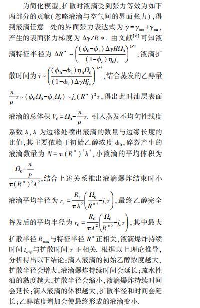 馬蘭戈尼效應是指由于表面張力不同的二種液體的界面存在表面張力梯度而使質量傳送的現象。出現馬蘭戈尼效應的原因是表面張力大的液體對其周圍表面張力小的液體的拉力強,產生表面張力梯度;使液體從表面張力低的方向向表面張力高的方向流動。此時引入馬蘭戈尼效應,就是對前文所說理論的一個形象簡潔的概括。當酒精濃度超過某一閾值,液滴擴散。酒精蒸發液滴外圍較薄的區域變得富含水,當外圍局部濃度小于閾值,擴散停止。空間上不均勻的混合物濃度產生沿液滴半徑的表面張力梯度,它們將溶質從油滴中心向外驅動。蒸發優先消耗位于邊緣附近的液滴最薄部分的酒精,而乙醇含量的變化導致朝向液滴邊緣的界面張力增加。這些梯度會在混合空氣和混合油界面處產生馬蘭戈尼切向應力,從而驅動從液滴中心到外圍的徑向流動。液滴邊緣脫濕和向外的馬蘭戈尼流動效應的結合導致液滴的外圍形成較厚的邊緣,從而變得不穩定,分裂成無數的小液滴,產生液滴爆炸的物理現象。馬蘭戈尼效應示意圖如圖4所示,黑箭頭代表蒸發量和厚度的徑向減小,灰色箭頭代表液滴中馬蘭戈尼應力與油層中的黏性應力平衡,導致大量流動。h(r,t)是液滴的厚度剖面,R(t)是中心液滴的半徑,H是油面厚度。