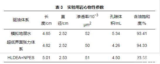 通過巖心動(dòng)態(tài)驅(qū)替實(shí)驗(yàn)評價(jià)體系提高采收率的能力,實(shí)驗(yàn)裝置見圖1。采用不間斷驅(qū)油的方式,以0.3 mL/min的注入流量驅(qū)油。分別考查模擬地層水、HLDEA+NPES體系和超低界面張力體系的驅(qū)油性能。實(shí)驗(yàn)用巖心物性參數(shù)見表3。實(shí)驗(yàn)的具體步驟如下。