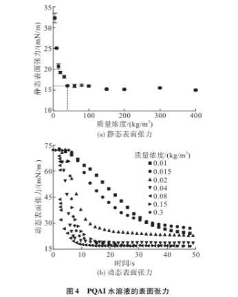 因此,本文采用芬蘭Kibron公司的表面張力儀在20一22℃下研究了溶液的界面性質(zhì),如靜態(tài)和動(dòng)態(tài)表面張力。不同PQAI溶液的靜態(tài)表面張力的變化如圖4(a)所示。可以看出,在去離子水中加人少量表面活性劑,溶液的表面張力急劇下降。然而,在質(zhì)量濃度>0.04kg/m2時(shí),下降趨勢(shì)開始緩慢。這意味著PQAI水溶液的pcMc~0.04kg/m2,此時(shí)表面活性劑水溶液靜態(tài)表面張力為16.07mN/m。