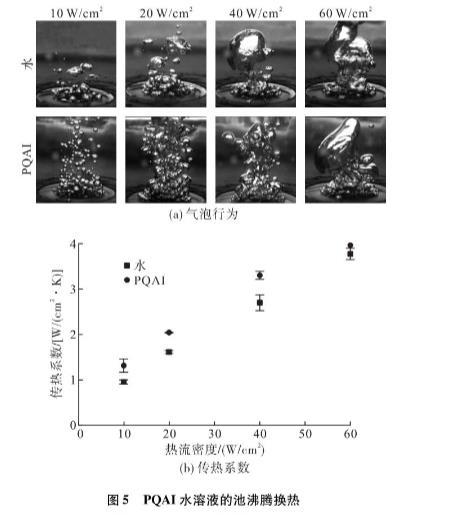 本文研究了PQAI溶液的池核沸騰換熱特性,試驗(yàn)臺(tái)參數(shù)參考文獻(xiàn)。圖5顯示了PQAI溶液在臨界膠束濃度下的沸騰傳熱性能。與水相比,由于PQAI水溶液中表面張力的降低,沸騰時(shí)產(chǎn)生的氣泡數(shù)量顯著增加,氣泡半徑減小。此外,在低熱流密度下,可以明顯觀察到在氣泡脫離時(shí)氣泡聚結(jié)的趨勢(shì)減小,并且氣泡的形狀更接近球形。表面活性劑分子由極性親水頭和疏水性長尾組成。