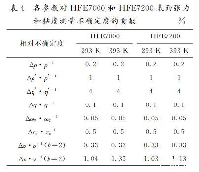 表4給出了式(11)、(12)中各參數對HFE7000和HFE7200表面張力和黏度在溫度上下限(T=293~393 K)的擴展測量不確定度的貢獻。其中,兩種物質在T=293 K時,表面張力擴展測量不確定度為0.33%,黏度擴展測量不確定度分別為1.04%和1.03%;當T=393 K時,表面張力擴展測量不確定度為0.33%,黏度擴展測量不確定度分別為1.35%和1.13%;表面張力的不確定度保持不變,隨著溫度的升高,黏度測量的擴展測量不確定度升高。越接近臨界溫度,氣相密度和黏度對擴展測量不確定度的貢獻越大。因此,本文HFE7000和HFE7200表面張力的擴展測量不確定度(置信因子k=2)估計為0.35%,黏度的擴展測量不確定度(k=2)分別估計為1.35%和1.13%。