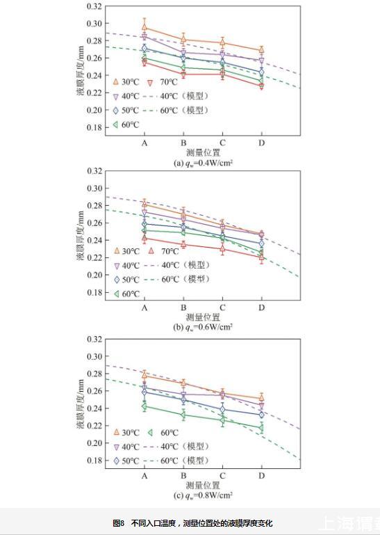 在加熱條件下,由于液體入口溫度不斷提升以及流經正在加熱壁面上,液膜將會產生水蒸氣冷凝在探針頭部,從而影響通過攝像機觀測液膜氣液界面的判斷。本實驗中,在探針底部粘貼一塊直徑為9mm的陶瓷加熱片,在加熱傾斜壁面的同時也加熱探針,避免水蒸氣凝結在探針頭部影響對液膜厚度的測量。為了觀測到傾斜加熱壁面上液膜出現干斑現象,減小去離子水的噴淋密度,但仍然確保液膜能夠完全鋪展在壁面上。圖8展示了在壁面傾斜角度為15°、噴淋密度為0.016kg/(m·s)的條件下,不同熱流密度和入口溫度對各測量位置液膜厚度變化的影響,并與模型計算值進行了對比。當入口溫度為70℃、熱流密度qw=0.8W/cm2時,液膜厚度變化消失,由于加熱壁面出現了干斑。