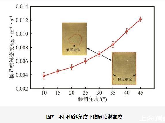 從圖7中可以看出,在較低的傾斜角度(如10°~25°)下,液膜受重力在壁面平行方向分量的影響較小,主要依靠噴淋液體的動能和潤濕性來維持覆蓋。此時,液膜較厚,表面張力對毛細波動的抑制作用較強,能夠有效抵御擾動,流動較為穩定,因此臨界噴淋密度較低。然而,在較高的傾斜角度(如30°~45°)下,重力在流動方向的分量顯著增強,液膜受到更大的重力驅動力作用,易發生滑移和局部脫離壁面現象。同時,傾斜角度增大會使液膜變薄,液膜內剪切力增大,進一步放大表面張力波動對擾動的響應,從而導致液膜對擾動的敏感性提高,流動不穩定性顯著增強。此外,局部區域的液膜破裂會導致液膜整體失穩,最終在兩側形成穩定細流。因此,為了維持液膜的完整性和連續性,需要提高噴淋密度以抵消重力和表面張力波動的破壞作用,從而導致臨界噴淋密度在高傾斜角度下顯著升高。