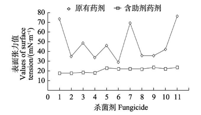 參照各供試殺菌劑田間推薦劑量,分別配置10 mL藥液2組,其中一組添加助劑,一組不含助劑。通過表面張力儀測試各藥液的表面張力值。每組設(shè)置3個重復(fù),以水作為空白對照。