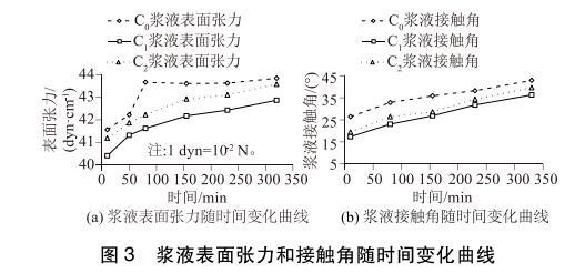 將配制好的C0、C1、C2 3種漿液每隔一定時間取樣進行表面張力和接觸角的測試。測得表面張力隨時間變化曲線見圖3(a),接觸角隨時間變化曲線見圖3(b)。