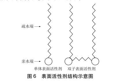 從圖3中可以看出加入表面活性劑S1、S2能降低漿液的表面張力和接觸角。這是因為本次漿液改性選用的表面活性劑S1、S2從化學結構上屬于雙子型非離子表面活性劑。傳統表面活性劑和雙子型表面活性劑結構示意圖如圖6所示。