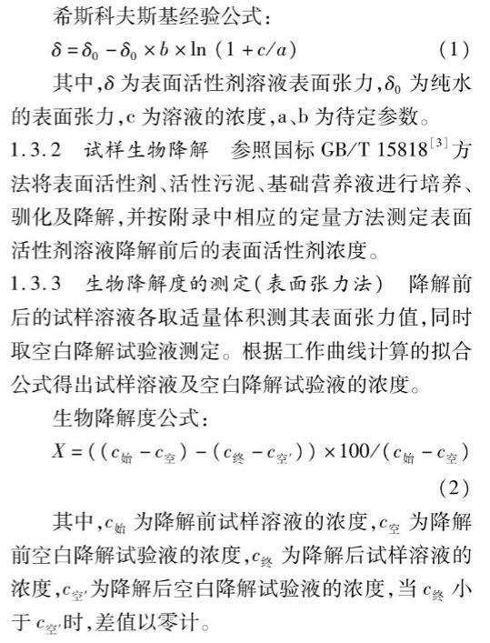 表面張力隨著表面活性劑的濃度變化而變化是表面活性劑的特性,利用該特性可以解決諸多問題。隨著表面活性劑的不斷研發探索,多種新型表面活性劑相繼上市,其中部分表面活性劑因具有獨特的分子結構導致無法用傳統的試驗方法測定其生物降解度。嘗試用表面張力法解決該問題,并與標準規定的方法做對比,分析該方法的可行性。