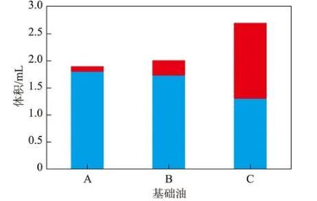 由圖1可以看出:未加復合劑時不同基礎油的分水效果不同,基礎油A和基礎油B的分水效果較好,水在離心作用下全部分出;基礎油C的極性物質含量高,親水性強,分水能力差,因此出現了乳化層。