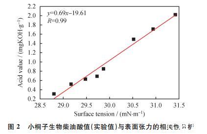 由圖2可知,擬合后得到的方程為y=0.69x-19.61,相關系數(shù)R=0.99,說明表面張力與酸值的相關度比較高。綜合圖1、圖2可知,氧化時間、表面張力、酸值三者之間的相關性較高,因此表面張力可作為評估生物柴油降解階段的參數(shù),可用于預測其酸值。