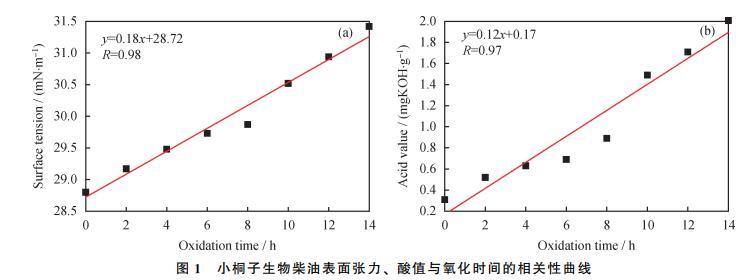 將氧化時間分別與小桐子生物柴油的表面張力、酸值進行相關性分析,結果如圖1所示: