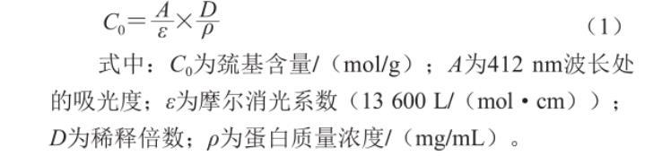 式中:C0為巰基含量/(mol/g);A為412 nm波長處的吸光度;ε為摩爾消光系數(13 600 L/(molgcm));D為稀釋倍數;ρ為蛋白質量濃度/(mg/mL)。