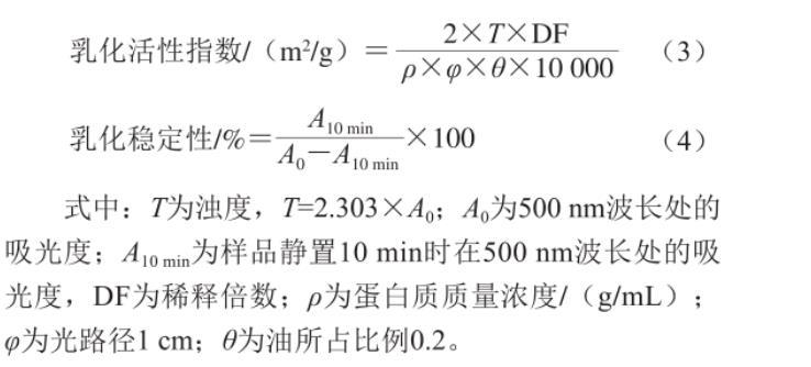 乳化穩定性:將上述制得的乳液在4℃靜置10 min后,從底部取20μL乳化液重復上述操作,在500 nm波長處測定吸光度。乳化活性指數和乳化穩定性的計算公式如下: