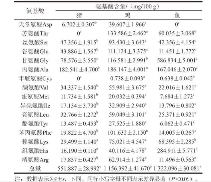 表1不同種類肉中肌漿蛋白的氨基酸含量