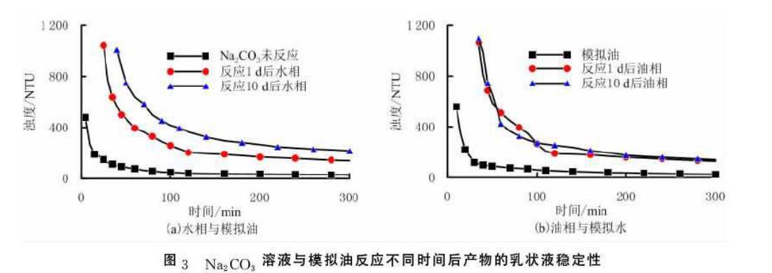 (3)與Na2CO3溶液與模擬油乳化所形成的乳狀液相比,Na2CO3溶液與模擬油反應后的水相與模擬油形成的乳狀液的穩定性增強。與模擬油與模擬水乳化所形成的乳狀液相比,Na2CO3溶液與模擬油反應后的油相與模擬水形成的乳狀液的穩定性增強。