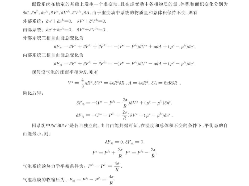 設氣泡穩(wěn)定時液膜為α相,泡外蒸汽為β相,泡內蒸汽為β2相,泡外表面為相,泡內表面為2相.若將氣泡表面理想化為標準球面,則表面相的物質量n"=n=0.當氣泡穩(wěn)定后系統(tǒng)滿足熱平衡條