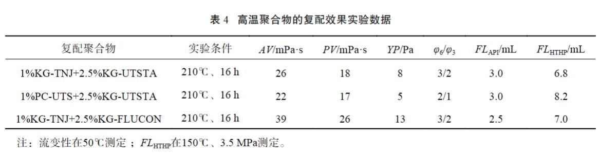 室內(nèi)以濾失改善效果較好的1%DrilFILHT為基礎,考察增黏劑KG-TNJ、PC-UTS與2種抗超高溫改性淀粉的復配效果,選定材料最佳組合。評價配方:基礎配方+1.0%DrilFILHT+復配聚合物,實驗結果見表4。