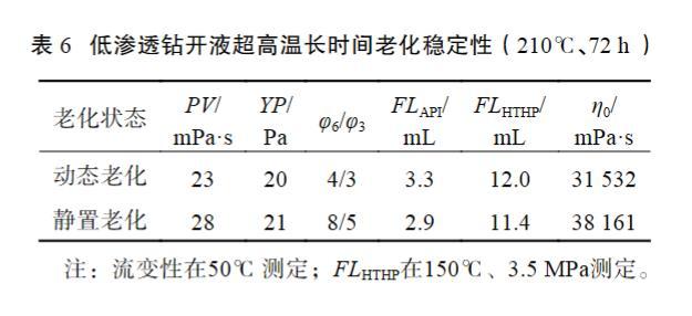 表6低滲透鉆開液超高溫長時間老化穩(wěn)定性(210℃、72 h)