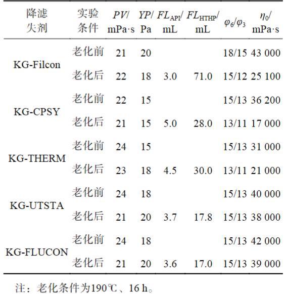 為避免超高溫下材料間的相互影響干擾判斷,室內(nèi)在190℃下先固定KG-TNJ作為增黏劑材料不變,對5種改性淀粉類高溫降濾失劑材料進行了初選。其中,KG-Filcon為海上常用抗高溫改性淀粉;KG-CPSY和KG-THERM均為聚合物接枝改性抗高溫淀粉;KG-UTSTA和KG-FLUCON均為室內(nèi)使用2-丙烯酰胺基-2-甲基丙磺酸AMPS、聚苯乙烯乳液與可溶性淀粉在堿性條件下通過接枝共聚生成抗超高溫改性淀粉,2者區(qū)別在于KG-UTSTA為機械攪拌條件下共聚合成,KG-FLUCON為超聲波機械協(xié)同方式混勻后再進行合成。評價配方:基礎配方+1.0%KG-TNJ+2.5%降濾失劑,實驗結果見表2。由表2可知,190℃老化后,各體系的流變性能穩(wěn)定,KG-UTSTA和KG-FLUCON體系的高溫高壓降濾失性最好,濾失量小于20 mL,KG-CPSY和KG-THERM體系的高溫高壓降濾失性能次之。分析原因為改性淀粉都引入了抗高溫接枝共聚單體,但是KG-FLUCON、KG-UTSTA除了引入AMPS類抗高溫單體外,還引入聚苯乙烯乳液,增加了接枝改性的抗高溫基團和空間結構,通過聚苯乙烯乳液組分的吸附、滲透、覆蓋包裹特性增強了對淀粉結構的高溫保護作用和產(chǎn)物的成膜封堵性能,改善了其抗高溫性和濾失造壁。