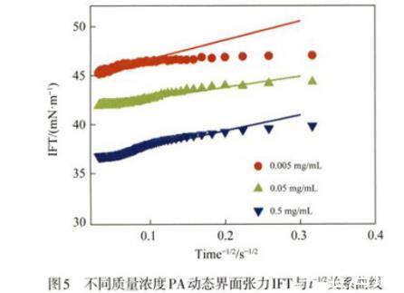 圖5不同質(zhì)量濃度PA動(dòng)態(tài)界面張力IFT與t-1/2關(guān)系曲線