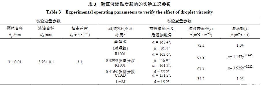 因此,碰撞速度v0設為3 m/s,液滴直徑dd設為4 mm。v0的大小通過液滴顆粒之間的豎直高度來設定,具體計算式為v0=√ ̄2gH,其中g為重力加速度,H為豎直高度,數值為40 cm。由于實驗誤差,v0測量值為3.1 m/s,dd測量值為3.93±0.1 mm。詳細的條件參數設置見表3。使用高速攝像機記錄樣品顆粒上剩余的附著液體量。