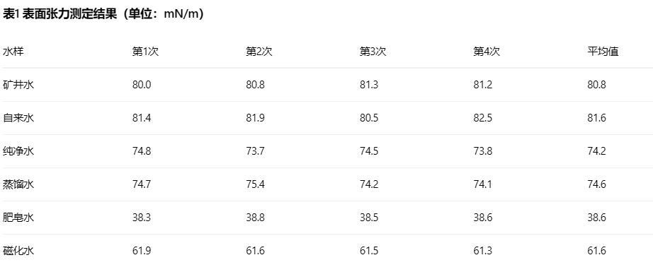 采用芬蘭Kibron公司生產(chǎn)的Delta-8全自動高通量表面張力儀對不同種類的水在室溫下進行測定,鉑金環(huán)浸入到水中一定的位置,隨著鉑金環(huán)與水之間的膜被拉長,使鉑金環(huán)受到一個向下的力,差動變壓器的磁芯隨鉑金環(huán)的下降而上升,使差動變壓器的線圈感應出一定的電壓值,這樣將被拉伸的薄膜變形量轉(zhuǎn)化為電壓量,經(jīng)微機處理轉(zhuǎn)化為相應的張力值,并自動顯示出來。隨薄膜逐漸被拉長,張力值逐漸增大,直至薄膜破裂,記下的最大值即水的實時張力。