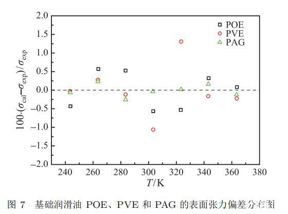 式中,T 是溫度,K;σ 是表面張力,mN·m?1;a、b 和 c 為關(guān)聯(lián)方程的擬合參數(shù)。基礎(chǔ)潤(rùn)滑油 POE、PVE 和 PAG 的參數(shù)關(guān)聯(lián)值和絕對(duì)平均偏差列于表 4 中,其實(shí)驗(yàn)數(shù)據(jù)與關(guān)聯(lián)方程的絕對(duì)平均偏差分別為 0.43%、0.45% 和 0.13%;三種基礎(chǔ)潤(rùn)滑油的相對(duì)偏差分布如圖 7 所示,其實(shí)驗(yàn)測(cè)量結(jié)果的相對(duì)偏差均在 ±1.5% 以內(nèi),表明實(shí)驗(yàn)結(jié)果與關(guān)聯(lián)方程的吻合良好。