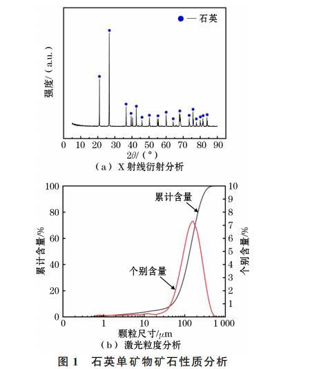 本試驗所用的單礦物石英取自某礦廠,將制備后的石英單礦物樣品進行X射線衍射(XRD)分析、X射線熒光光譜(XRF)分析和激光粒度分析,XRD的分析結果如圖1(a)所示,XRF的分析結果見表1,粒度分析如圖1(b)所示。從圖1(a)可以看出,石英單礦物SiO?峰強度以及密度最高,說明SiO?占主導地位。從圖1(b)可以看出,樣品的中值粒徑D??達到了133.5μm,D??則達到了264.3μm.綜合上述礦物的純度以及粒度,石英可滿足后續單礦物試驗以及機理分析的要求。