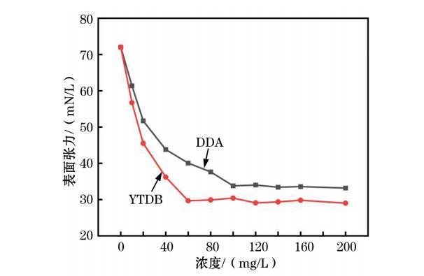 圖6顯示了DDA與YTDB在石英礦漿中的表面張力。由圖6可知,隨著捕收劑濃度增大,液體的表面張力均逐漸降低。在DDA捕收體系中,當濃度增加到100 mg/L時,液體的表面張力開始趨于穩定,再增加DDA濃度,表面張力變化不大。故DDA體系下,液體的最低表面張力約為33.79 mN/m,臨界膠束濃度為100 mg/L;在YTDB捕收體系中,當濃度增加到60 mg/L時,液體的表面張力開始趨于穩定,再增加YTDB濃度,表面張力變化不大。故YTDB體系下,液體的最低表面張力約為29.67 mN/m,臨界膠束濃度為60 mg/L.綜上所述,從表面張力來看,YTDB形成膠束和降低表面張力能力更強,疏水性更好,捕收能力更強。