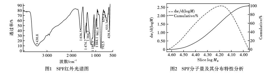 1)SPF紅外光譜分析(IR)SPF紅外光譜結果見圖1,3430.8cm?1為羥基伸縮振動峰,這不可能是醇羥基,而是酚羥基。3000cm附近有一個小峰,在1474.7cm是亞甲基變形振動峰,說明SPF中含有亞甲基。1636.5cm是苯環上的C=C鍵伸縮振動產生的特征吸收峰,在指紋區中的792.5cm?1區域中的譜帶是取代苯的1,2,6取代的特征吸收峰。1186.5cm?1和1044.1cm?1是由于S=O鍵伸縮振動產生的特征吸收峰,在700—500cm?1的連續吸收峰是S—O、S—S、C—S鍵伸縮振動產生吸收峰。SPF產物的分子中含有磺酸基、羥基和亞甲基等官能團。