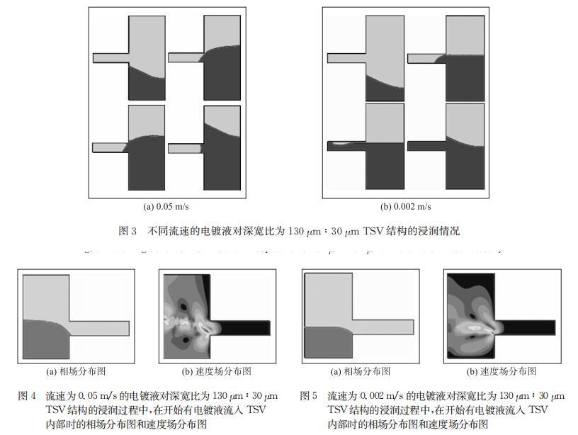 TSV深寬比設置為130μm:30μm,電鍍液流人速度為0.05 m/s和0.002 m/s的浸潤仿真結果分別如圖3所示,前者在TSV底部形成氣泡,后者可以完全浸潤。模擬結果表明降低電鍍液流入速度有利于浸潤。通過仿真中兩種情況下浸潤過程中的流速場對比,可以看出在電鍍液流入的過程中,電鍍液流人速度較大時,如圖4(b)所示,電鍍液表面距離TSV較遠的部分有著相對更大的流速,即電鍍液流過TSV上方的速度大于電鍍液向TSV內部流入的速度,導致在電鍍液流過TSV上方時,其流入TSV內部的分流量還沒有充滿TSV內部排出其中氣體之前,電鍍液就已經流過了TSV上方,并將TSV口部封死,導致內部殘留氣體無法排出,形成不完全浸潤;而當電鍍液流入速度較小時,如圖5(b)所示,電鍍液表面在TSV口部附近具有相對更大的流速,即電鍍液向TSV內部流入的速度大于其流過TSV上方的速度,使得電鍍液流過TSV上方時,有足夠的分流量流入TSV內部,將其中氣體排出并將TSV填滿,實現完全的浸潤。