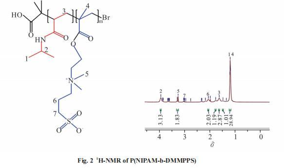 對P(NIPAM-b-DMMPPS)進行核磁表征,結果如Fig.2所示。δ1.19處的1峰屬于CCH3;δ3.97處的2峰屬于一CH2一。同樣,P(NIPAM-b-DMMPPS)中譜圖中也有對應于PDMMPPS的特征峰:δ3.60~3.67,δ3.11,δ2.17,δ2.95處的峰分別代表PDMMPPS中一N+一CH2一,一N+一(CH3)2,一CH2一和一CH2一SO3一上的氫質子峰。核磁結果表明了嵌段聚合物P(NIPAM-b-DMMPPS)的成功合成。